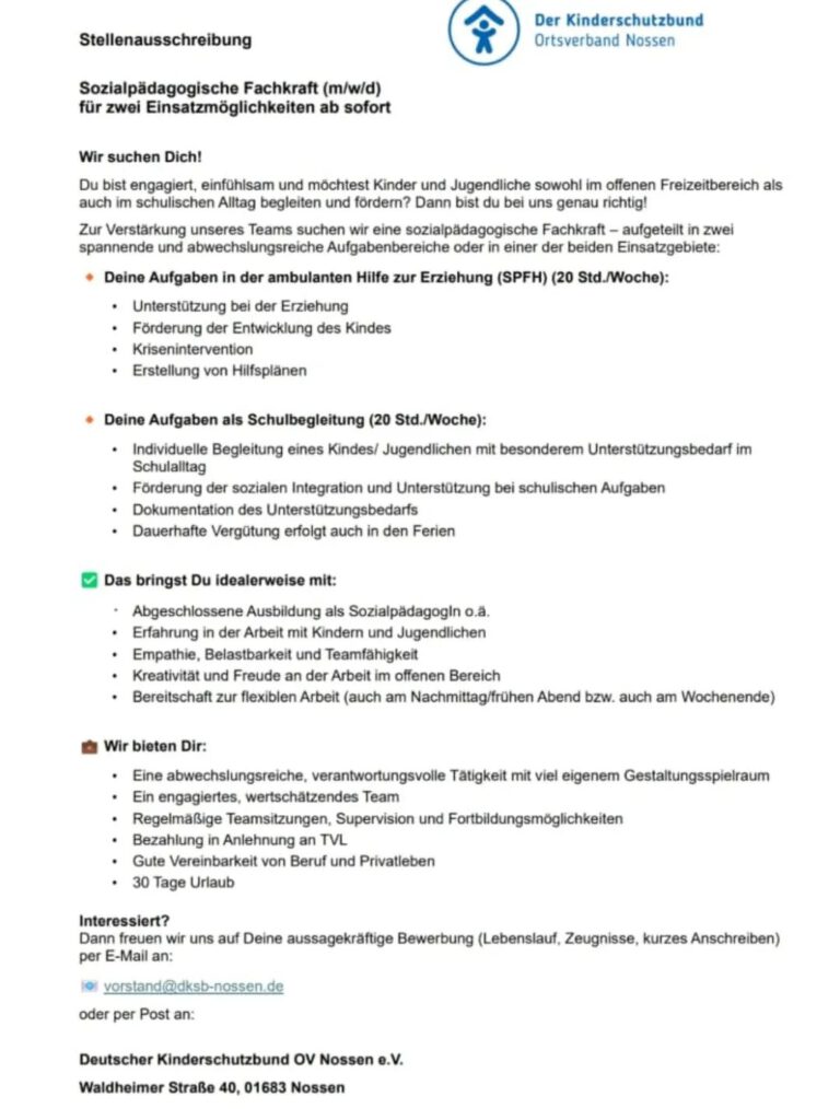 Der Kinderschutzbund Ortsverband Nossen e.V. Allgemein Stellenausschreibung: Sozialpädagogische Fachkraft (m/w/d) für zwei Einsatzmöglichkeiten